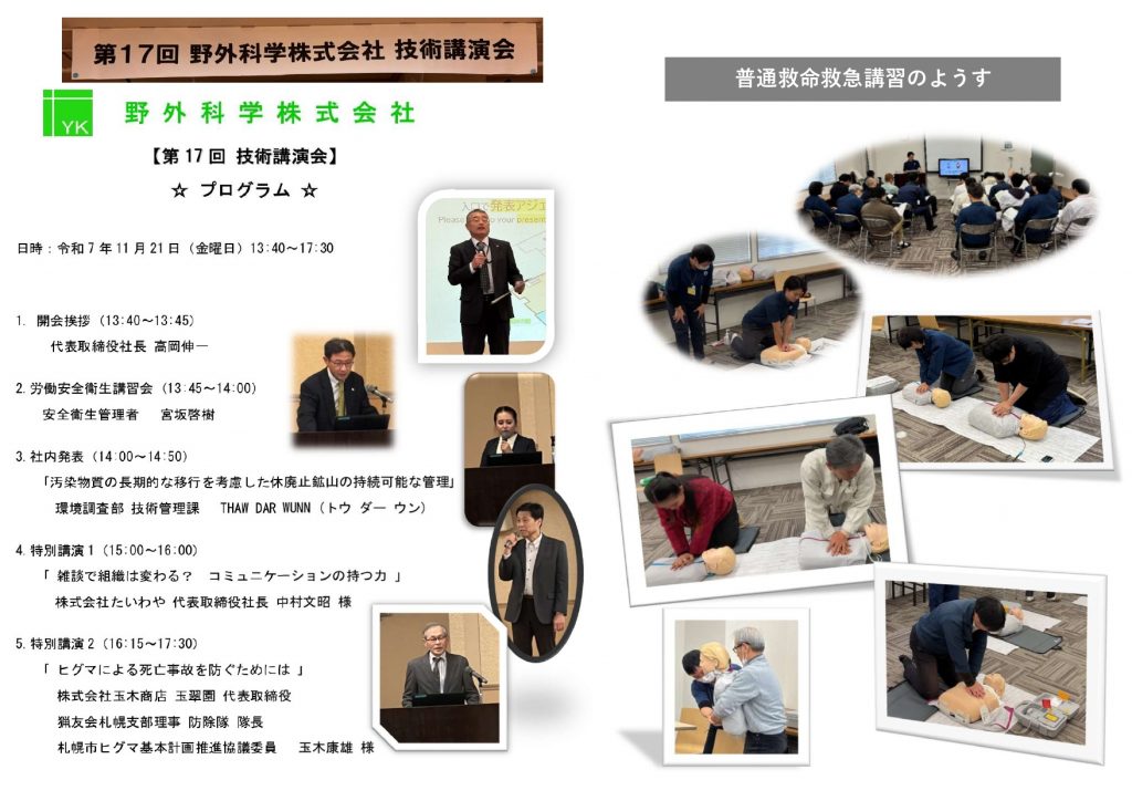労働安全衛生講習会に引き続き、社員からは「汚染物質の長期的な移行を考慮した休廃止鉱山の持続的な管理」の学術研究、社外講師として第1部に株式会社たいわや 中村社長より「雑談の必要性」のお話でコミュニケーションの重要性と第2部に株式会社玉翠園 玉木社長(猟友会札幌支部理事 防除隊 隊長)より「ヒグマによる事故を減らす」取り組みへのお話を頂きました。昨今の人の生活エリアでの熊の出現が増えていることから、業務被害の発生リスクを防ぐ試みです。
